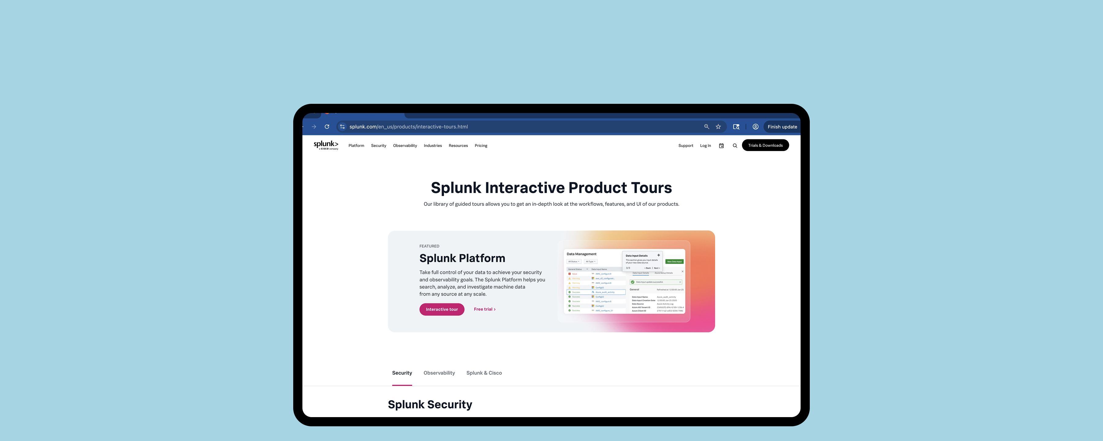 The Demo Center live on splunk.com. Navigation reduced from 3+ clicks (Resources > Filter > Product Tours) to a single prominent entry point from the homepage.
